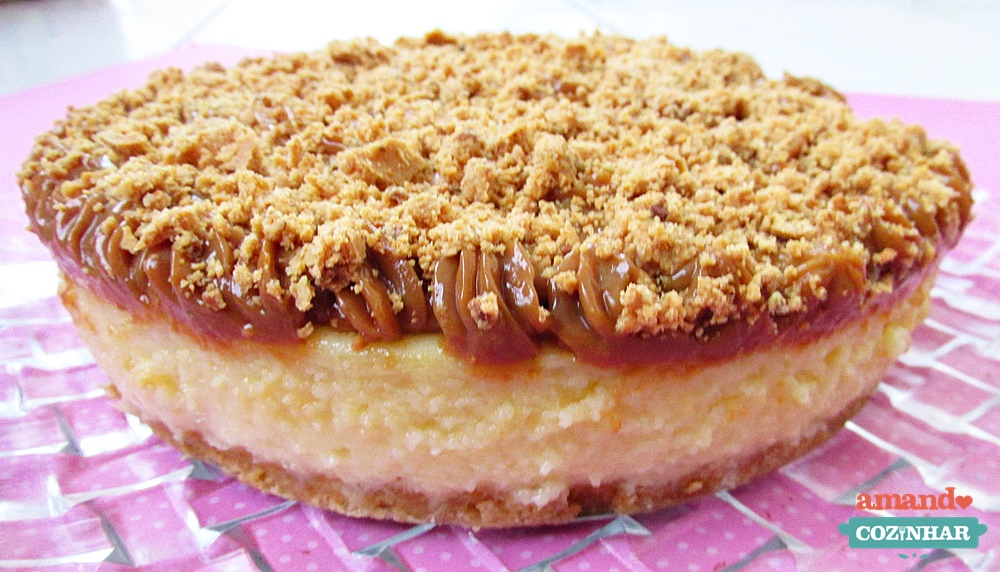 O cheesecake é cozido em banho-maria e tem a massa bem levinha e macia, ele vai por cima de uma camada de farofa de biscoitos, e por cima do cheesecake eu coloquei doce de leite caseiro e paçoca esfarelada. Não ficou muito doce, nem enjoativo, ficou perfeito, todos amaram.