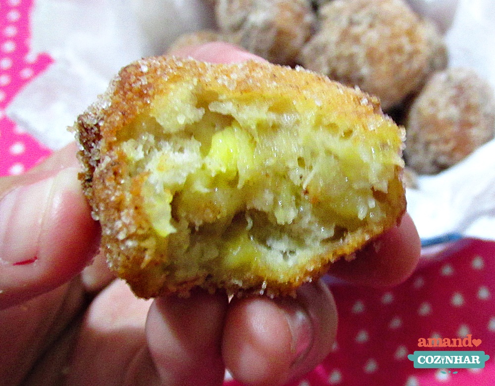 Receita de bolinho de banana com a casquinha crocante, coberto por açúcar e canela. Só dois ingredientes, super fácil de fazer.
