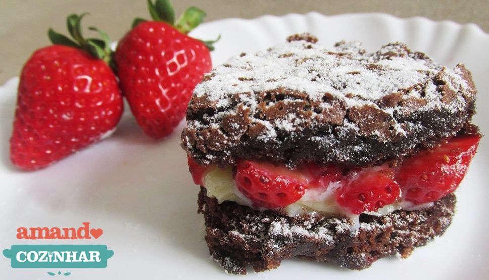 Receita de brownie com casquinha crocante, macio por dentro recheado com brigadeiro de ninho e morangos.