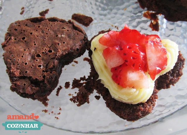 - Corte o brownie em cubos ou use um cortador, depois usando uma faca divida cada pedaço no meio. Coloque o recheio em um saco de confeitar com um bico pitanga grande e coloque o recheio em uma das metades e coloque também um pouco dos morangos picados, depois coloque a outra metade do brownie por cima.